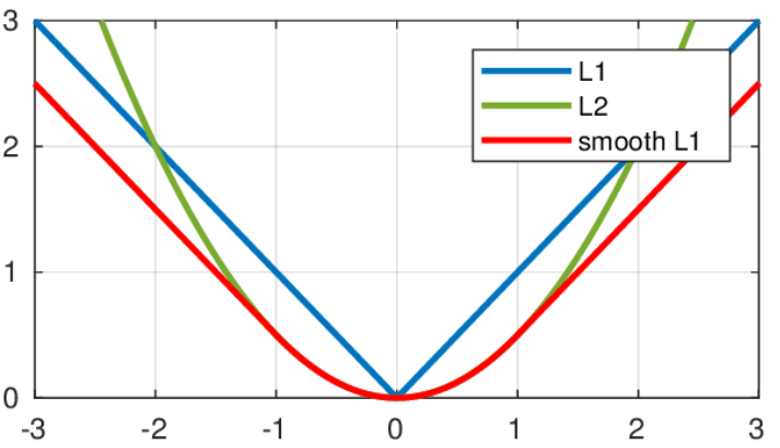 아래 그림은 L1 loss, L2 loss, smooth L1 loss를 나타낸 것이다.