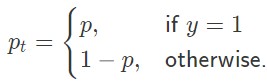 y=1일때 pt=p이므로 p가 작을수록 (1-p)가 커져서 loss가 커진다. 반대로 p가 커지면 (1-p)가 줄어서 loss가 작다.