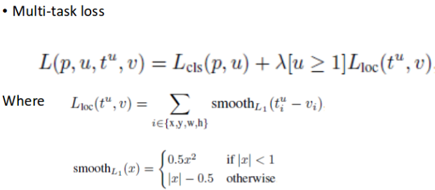 이제 Fast R-CNN의 Loss function은 위와 같이 classification과 localization loss를 합친 function으로써