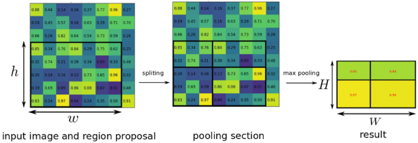 위 작업을 통해 feature map에 투영했던 hxw크기의 RoI는 HxW크기의 고정된 feature vector로 변환된다.