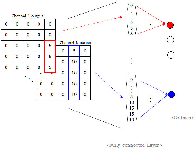 따라서 위 예시와 같이 feature map k에 높은 값들이 많이 있으면 output node k는 높은 값을 갖는다.